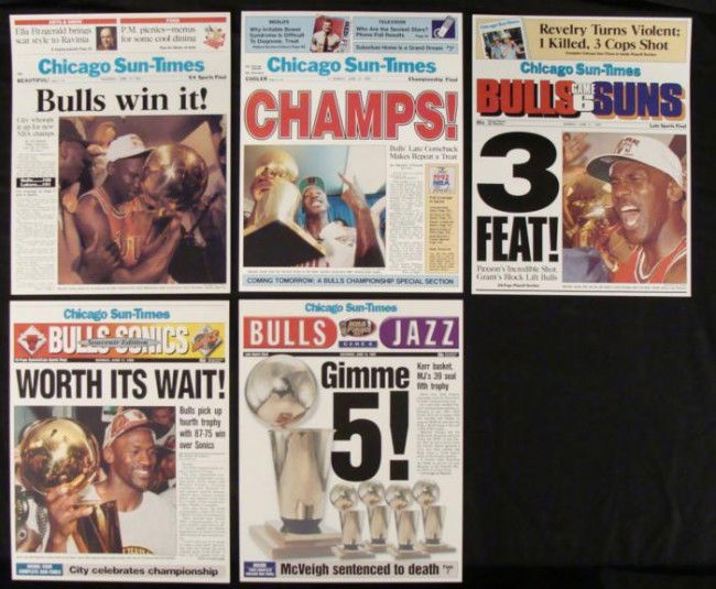 A Real Collectors Item for Chicago Bulls Fan. Chicago Bulls Collectibles-Michael Jordan era many item 100 Chicago. The newspapers include Chicago Tribune dated June 15 1992 The Daily Herald dated October 7 1993 Chicago Sun-Times.